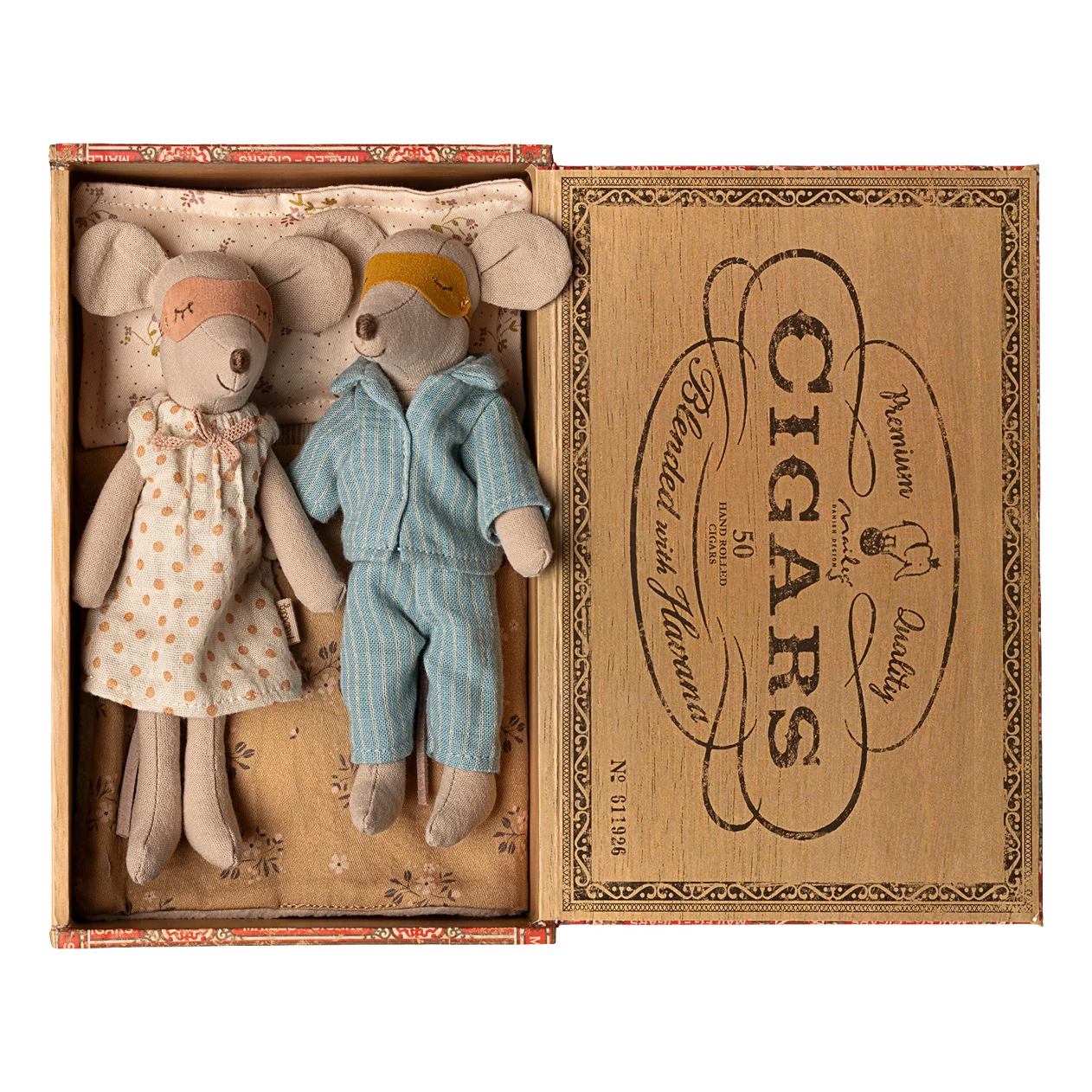 Ein klassischer Maileg-Artikel. Mama und Papa Mäuse tragen ihre schöne Nachtwäsche und Augenmasken. Die Zigarrenkiste ist ein perfektes Bett für einen erholsamen Schlaf und süße Träume. Bettwäsche kann in der Farbe variieren.