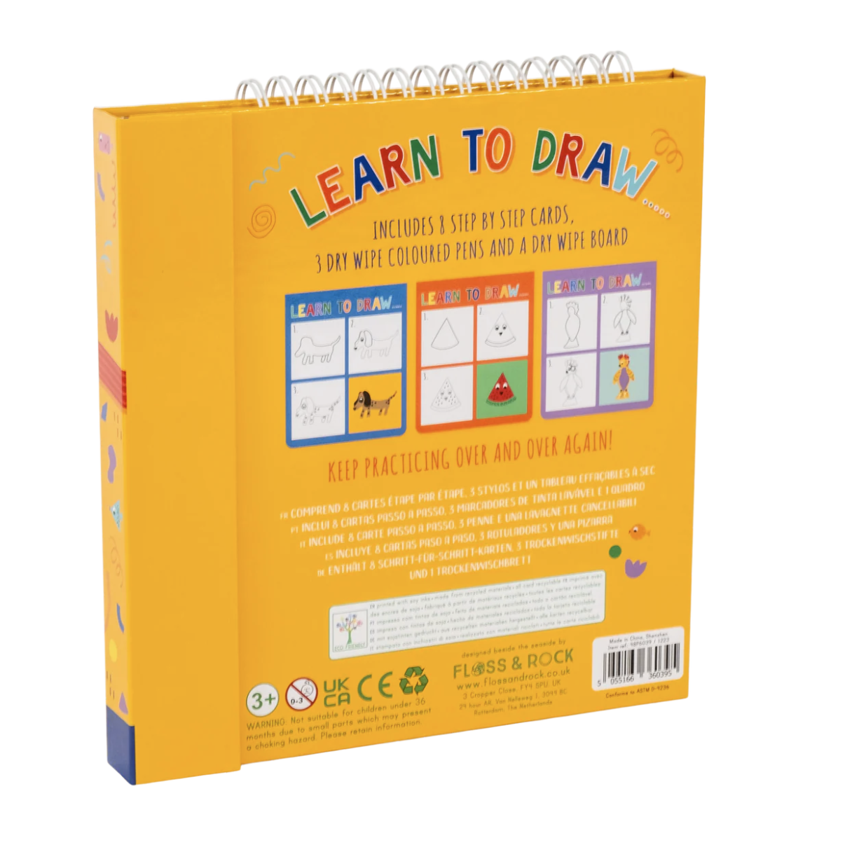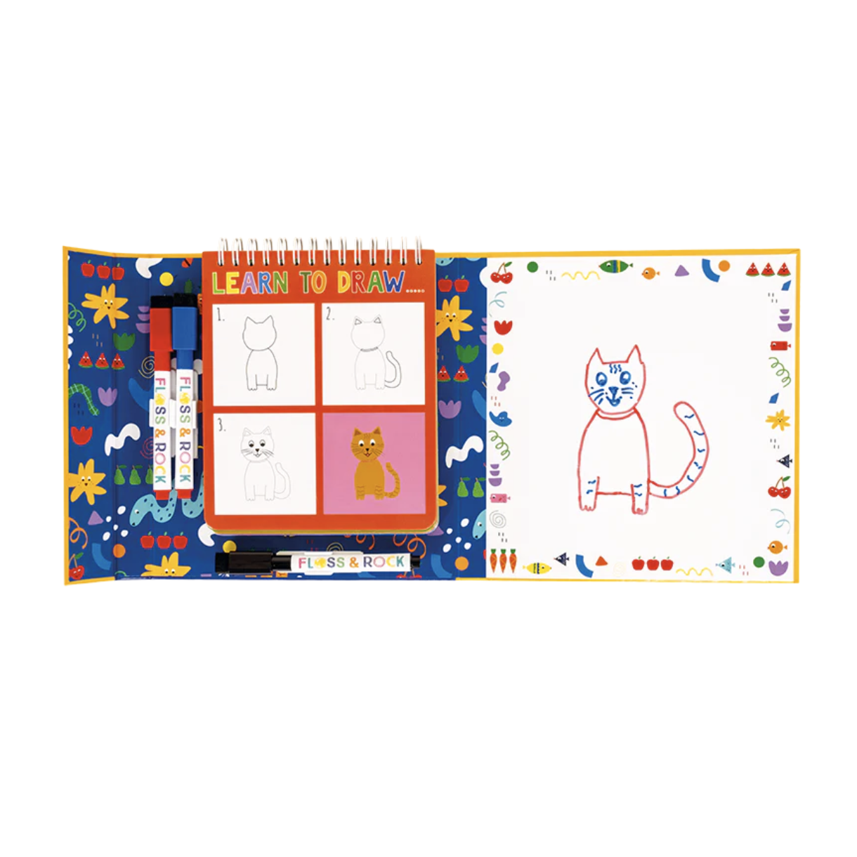Mit dem Learn To Draw Pets-Set entdecken Kinder spielerisch ihre kreative Seite! Auf 8 stabilen, abwischbaren Seiten lernen sie in drei einfachen Schritten, ihre Lieblingstiere zu zeichnen – vom verspielten Hund bis zur neugierigen Katze. Mit den drei farbigen Stiften und integrierten Radierern lassen sich die Zeichnungen immer wieder neu gestalten. Dank Magnetverschluss und handlichem Format ist das Buch perfekt für Reisen oder kreative Momente unterwegs.