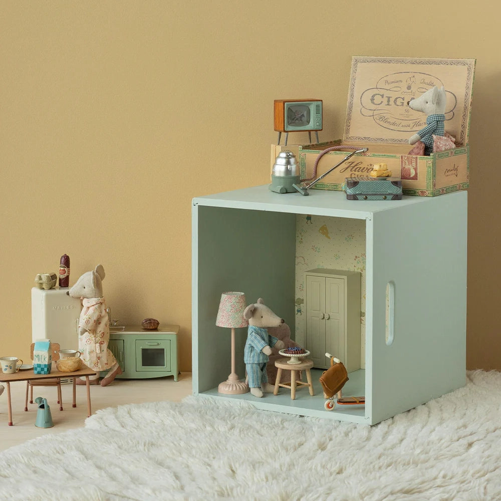 Oma und Opa tragen ihre Nachtwäsche, Augenmasken und schöne Schuhe. Die Zigarrenkiste ist ein perfektes Bett für einen erholsamen Schlaf und süße Träume. Erweiter die Garderobe mit lockeren Kleidungsstücken, um ein perfektes Spielset zu erstellen.