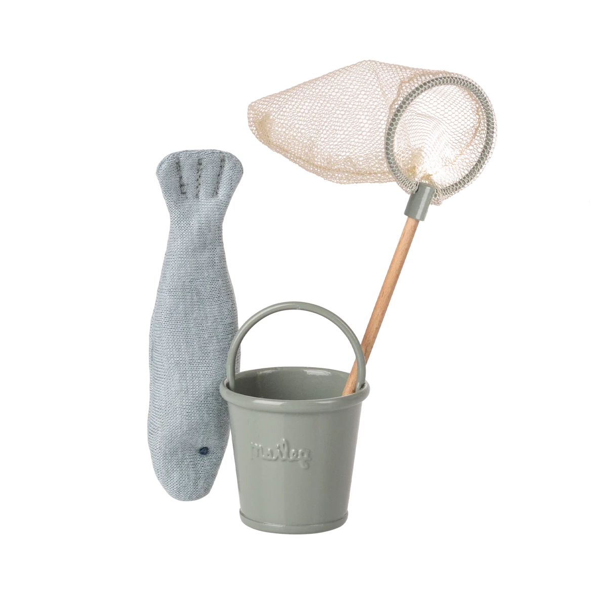 Das Angelset enthält alle wichtigen Utensilien, die die Mäuse für einen schönen Angelausflug benötigen. Einen Fisch, ein Fischernetz und einen Eimer, um den Fang des Tages nach Hause zu bringen.