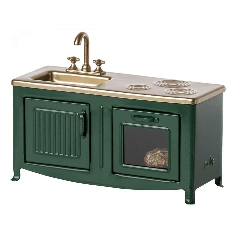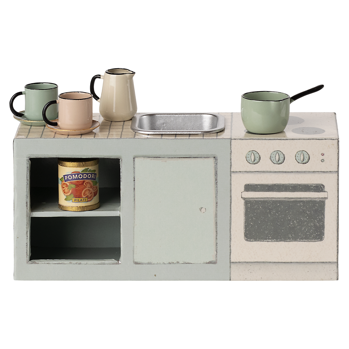 Zaubere im Handumdrehen ein bisschen Miniatur-Magie mit der Küchentheke Maus. Dieses bezaubernde Küchen-Set aus Karton umfasst ein Spülbecken aus Metall, offene Regale, einen illustrierten Backofen mit Herdplatte – sowie liebevoll gestaltetes Mini-Zubehör aus Metall: zwei Tassen mit Untertassen, eine Kanne, einen Kochtopf und eine Dose Tomaten.
