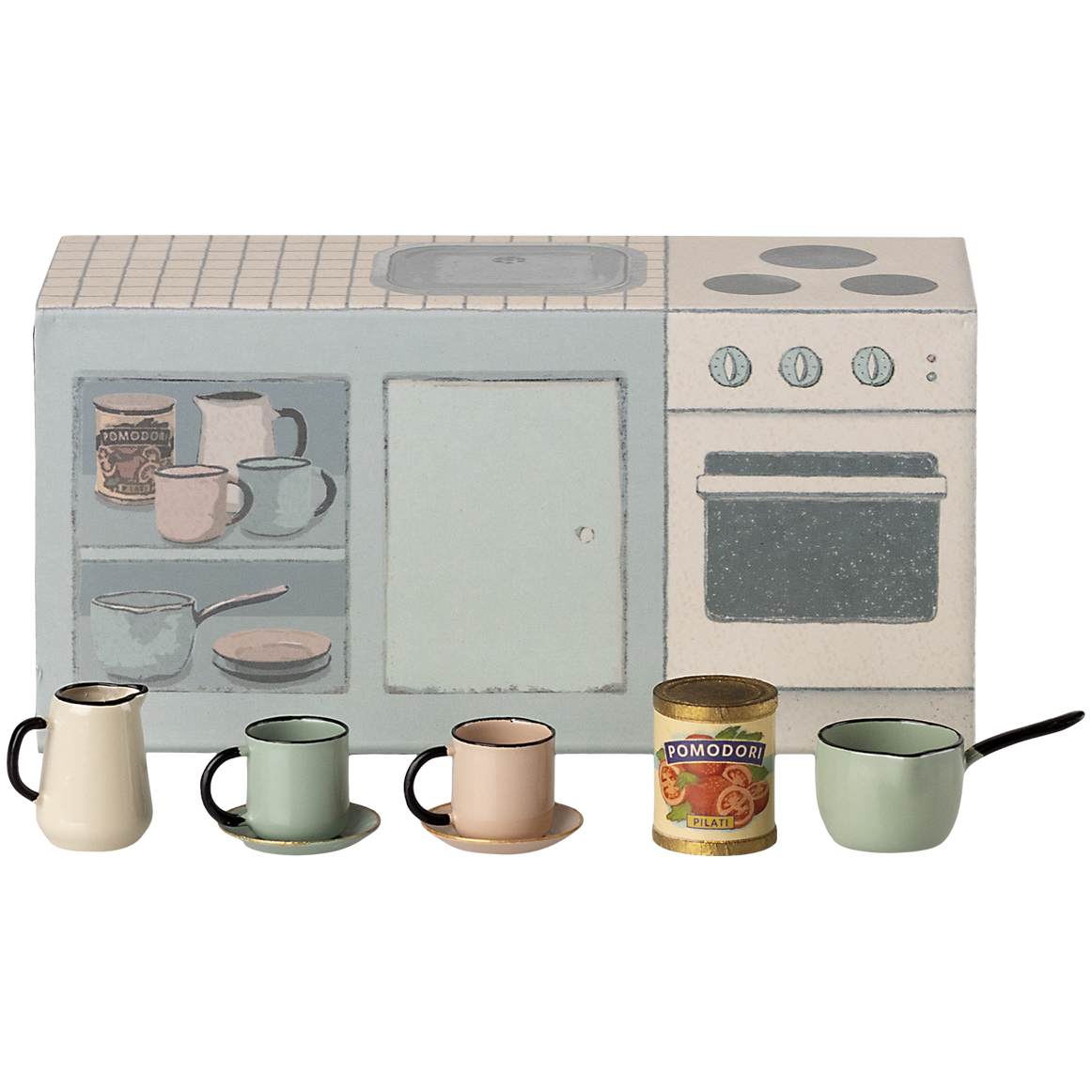Perfekt im Maßstab für Maileg-Mäuse und ideal passend zum SuitCasa House ist dieses Set eine wunderbare Einladung zum fantasievollen Spiel und lässt gemütliche Küchenszenen im Kinderzimmer lebendig werden.