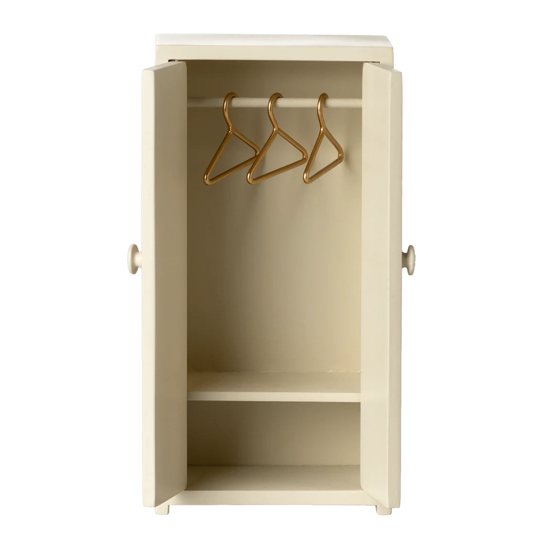 Ein kleiner Schrank auf Holz. Er hilft der Mäusefamilie, ihre Garderobe zu organisieren. Der Schrank wird mit 3 goldenen Kleiderbügeln geliefert.