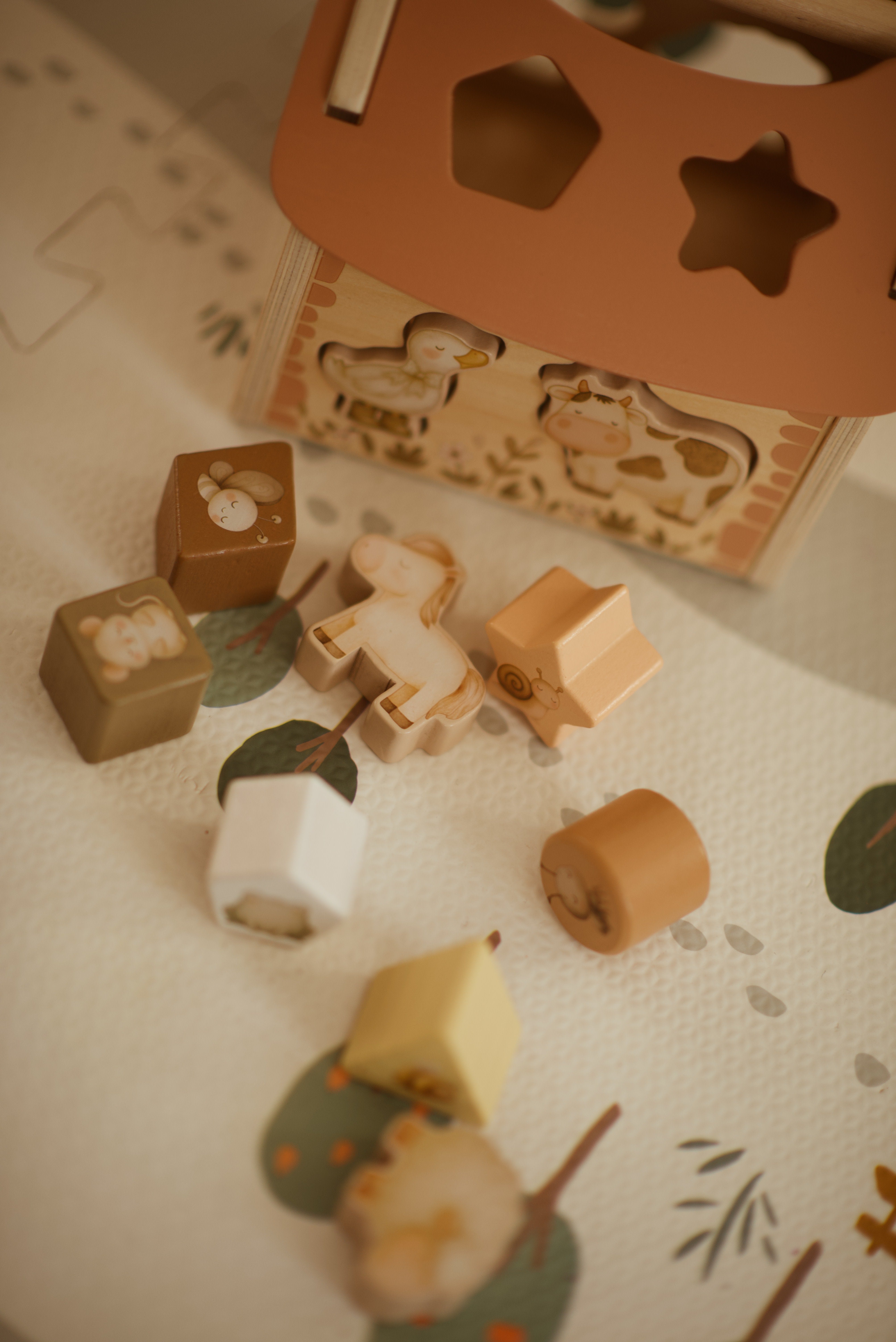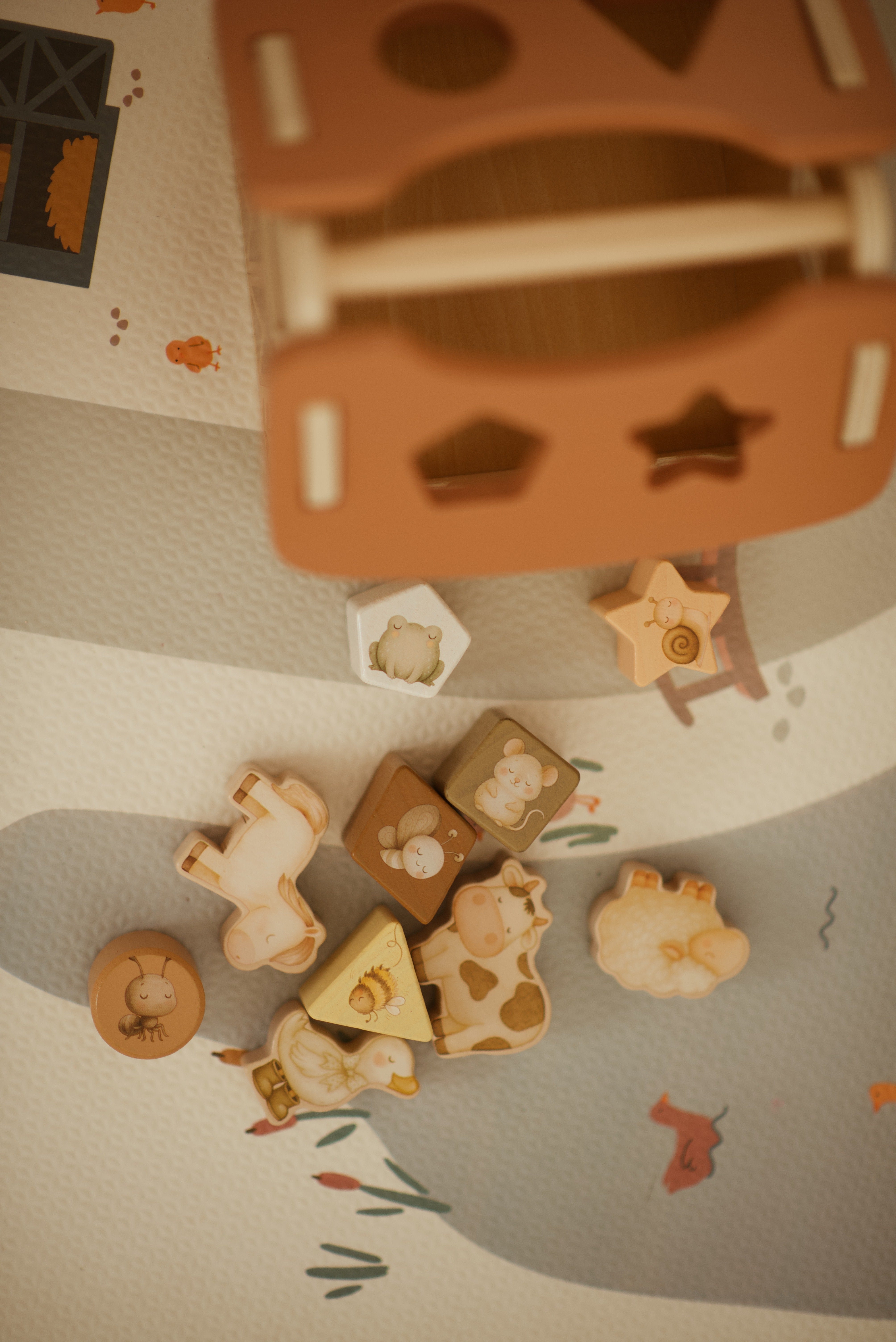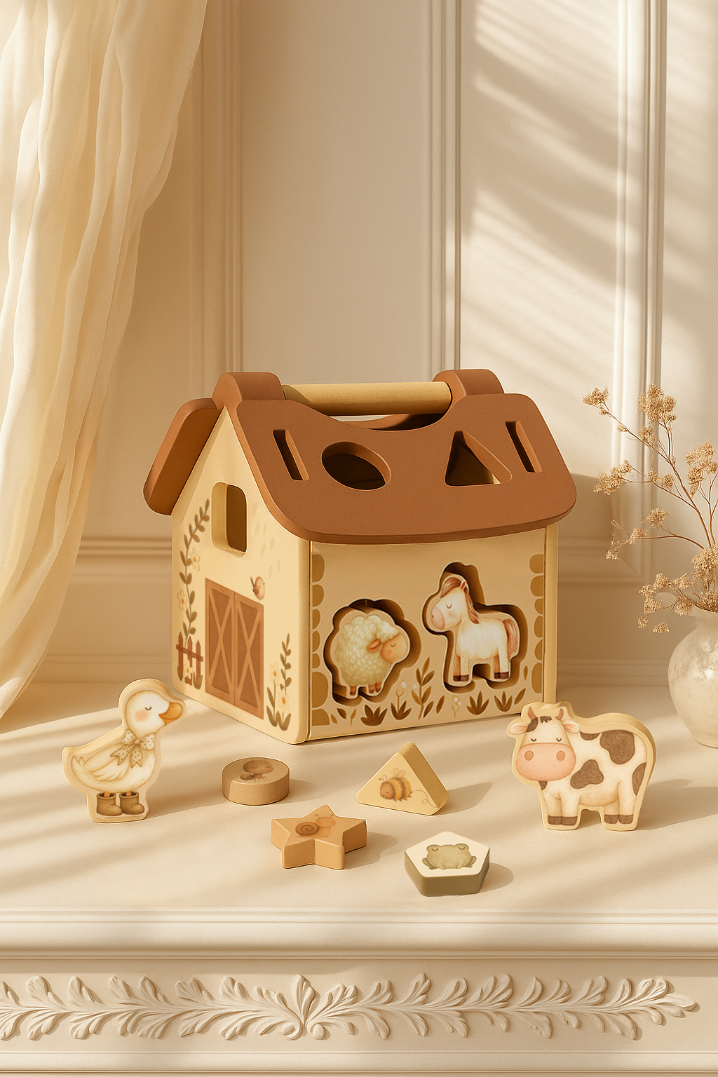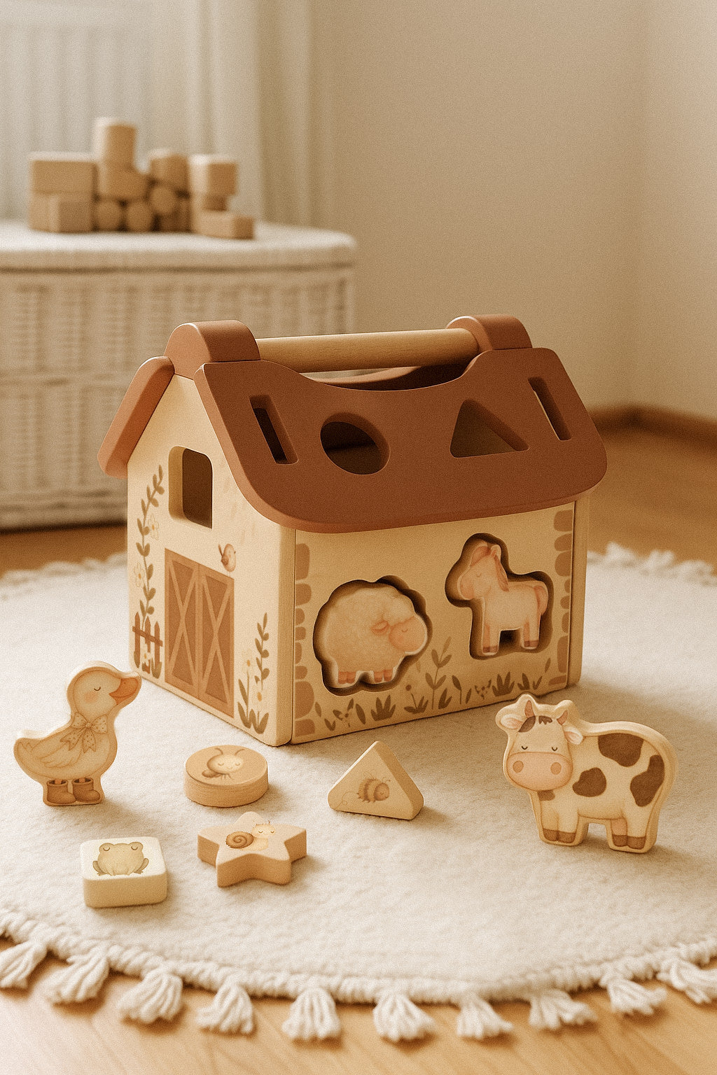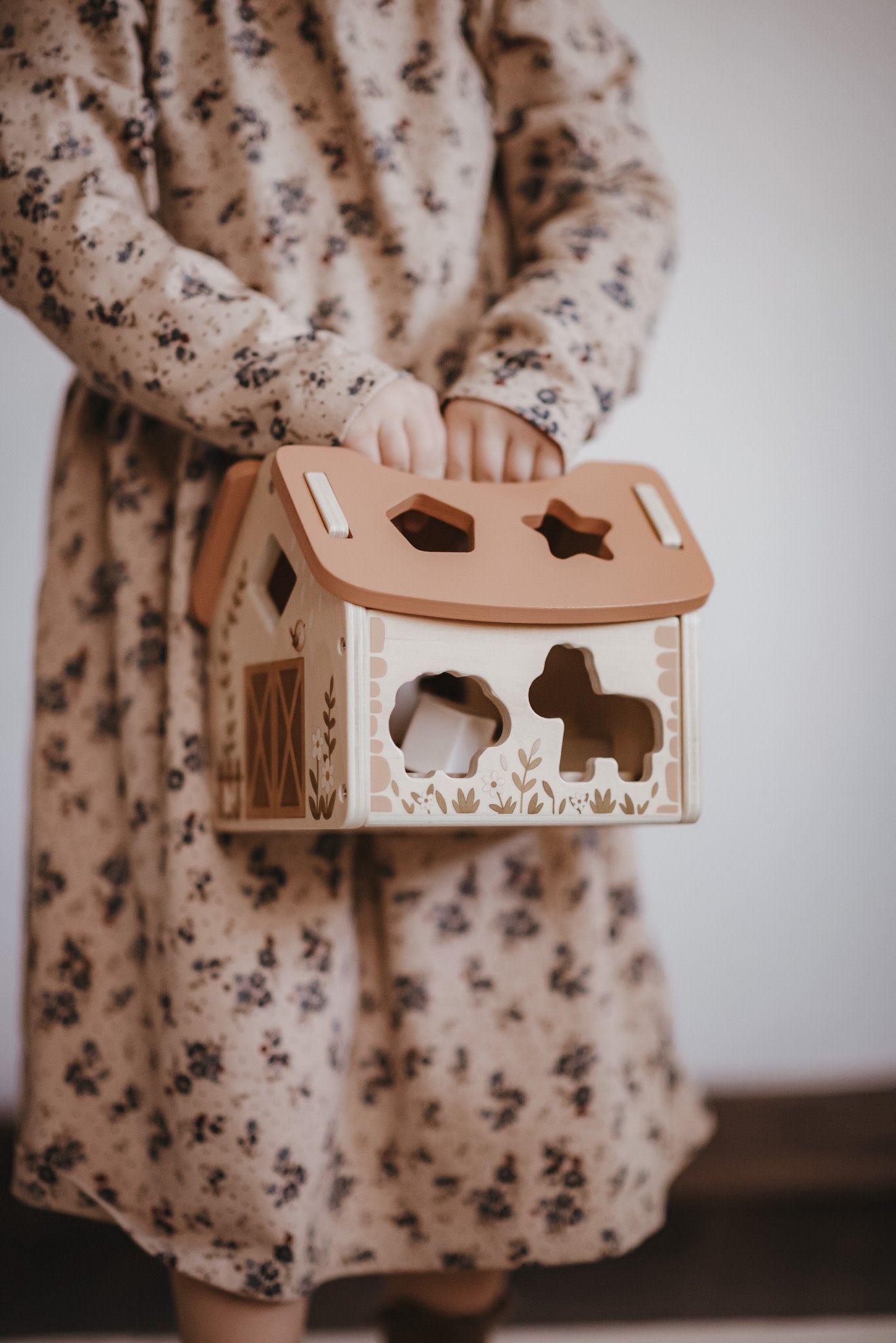 ✔ Bauernhof-Formsortierer aus Holz mit süssem Stall-Design