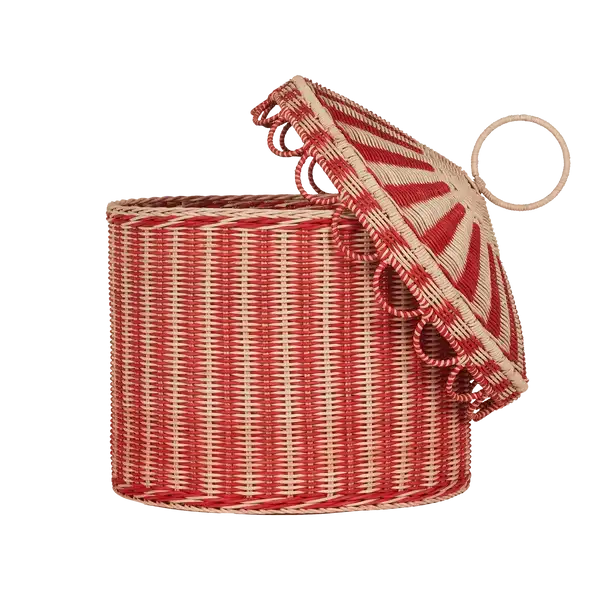 - Grosser Spielzeugkorb/-korb aus geflochtenem Rattan in Form eines Zirkuszelts mit abnehmbarem Deckel.