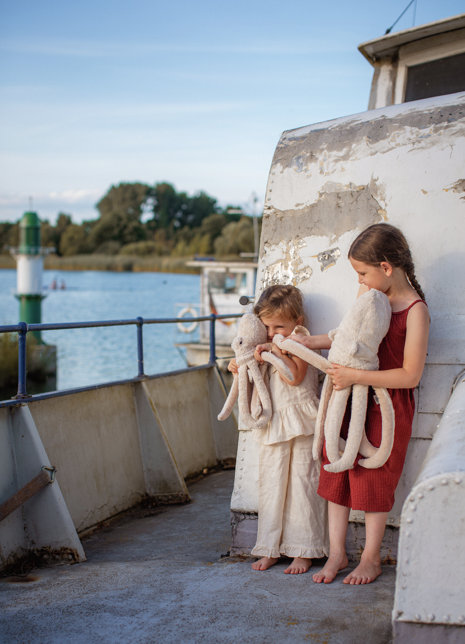 The large octopus in Powder combines modern, playful design with functional naturalness. Made from GOTS-certified organic cotton and filled with pure sheep's wool , it offers a pleasantly soft feel and soothing warmth. Inside is a removable spelt husk pillow that provides comforting warmth or gentle cooling as needed – ideal for relaxing moments before bed, minor aches and pains, or simply for cuddling.