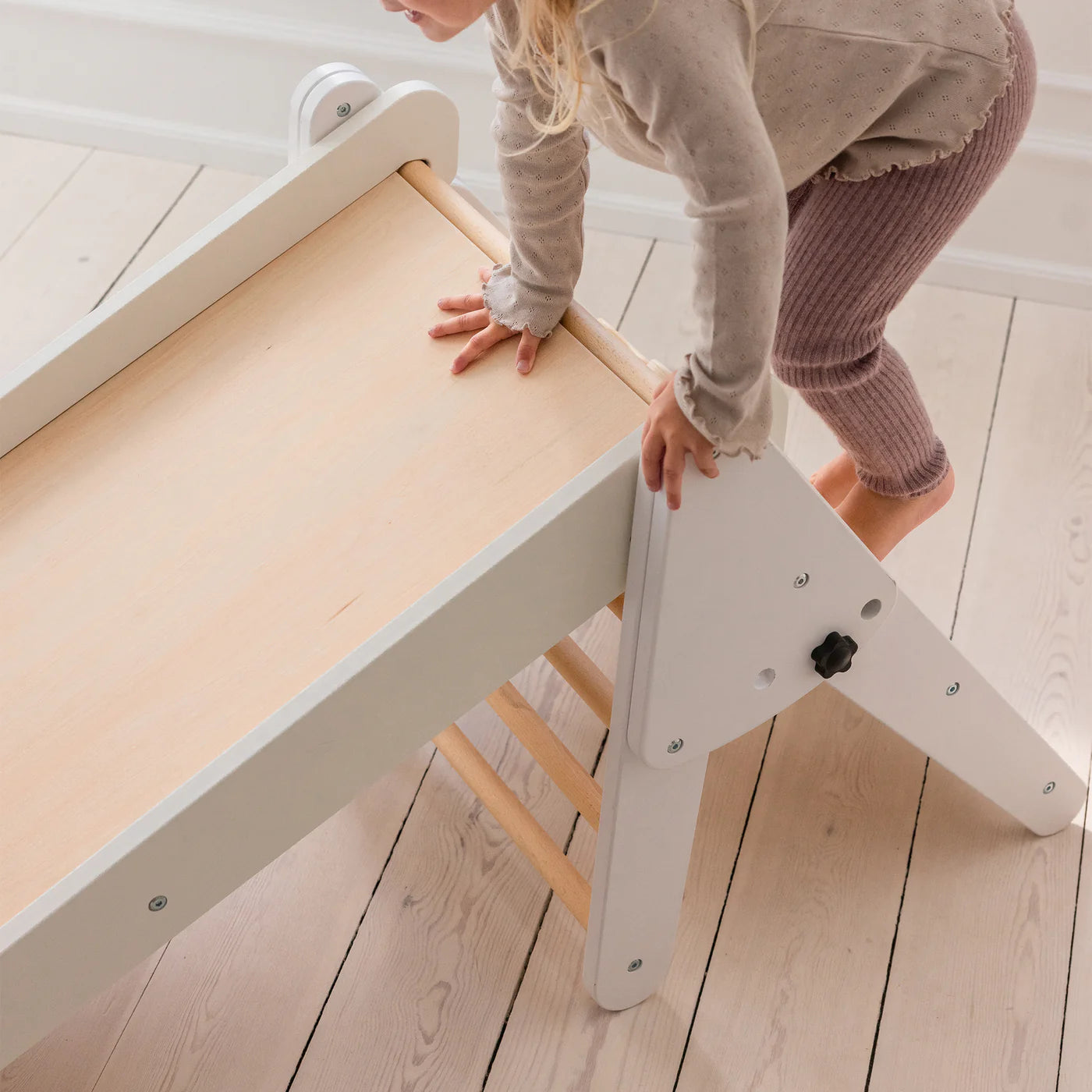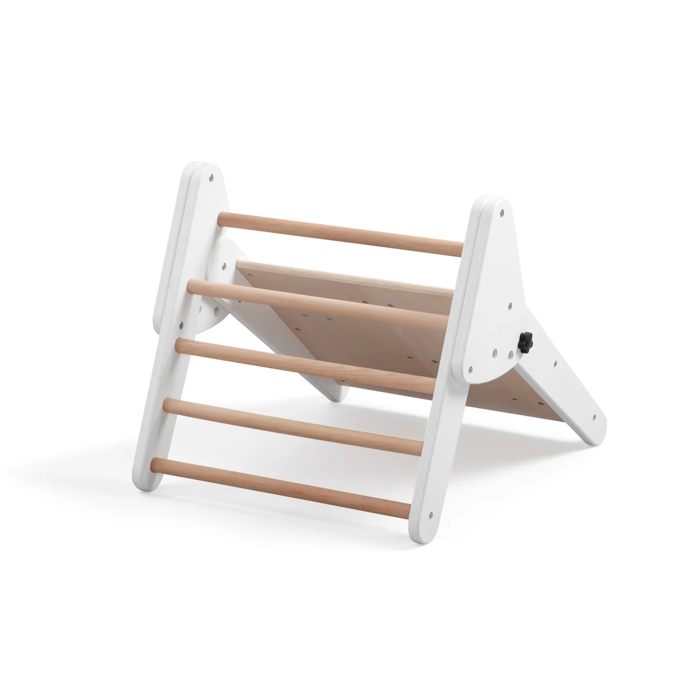 One side is equipped with sturdy rungs, the other with six climbing holds – guaranteed to keep things interesting. When not in use, the triangle folds up to save space, for example, for storage under the Sebra bed. Combined with the Sebra roller slide, it creates a particularly versatile indoor play structure for little adventurers.