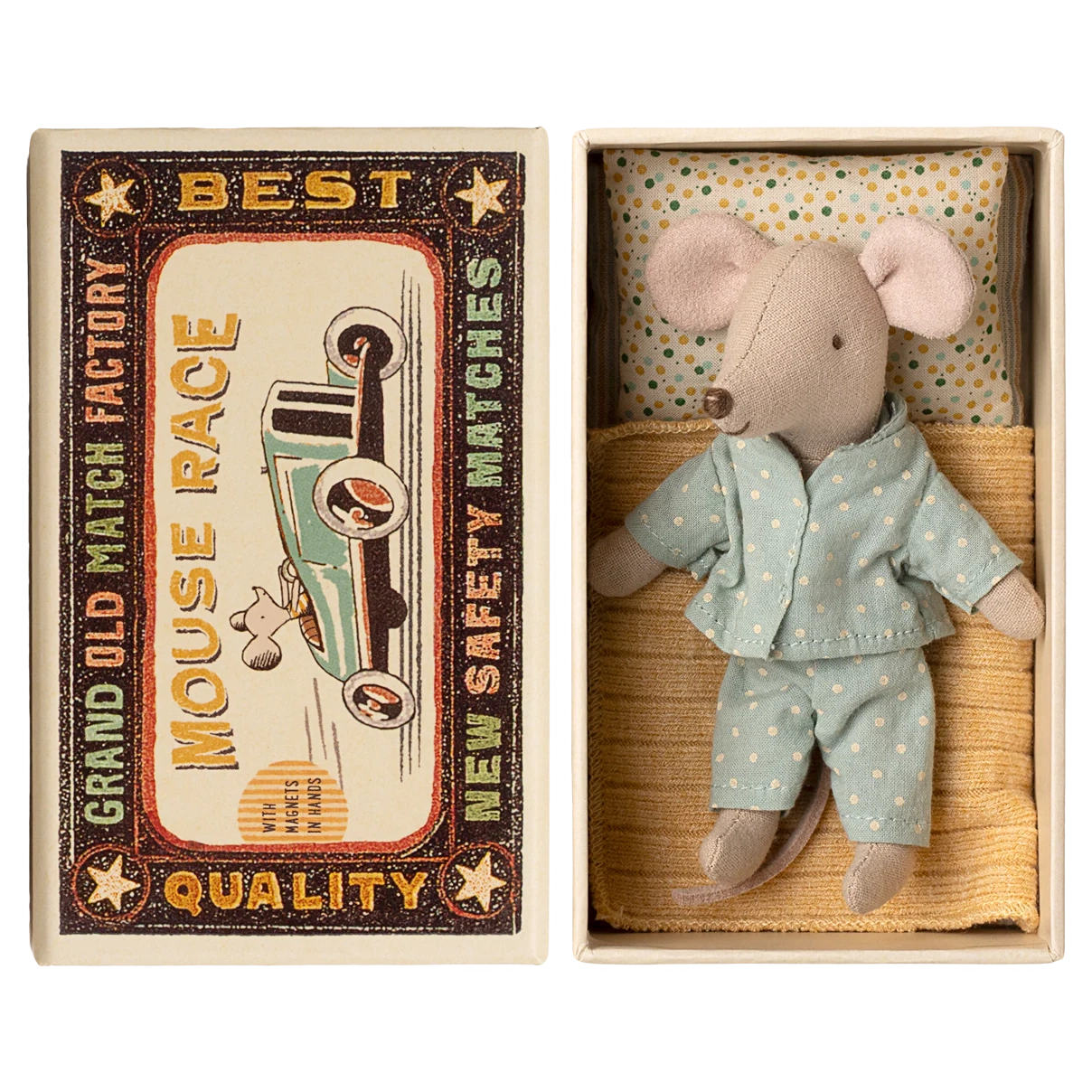 This mouse is a classic Maileg item, ready for hours of play and a good night's sleep in its little matchbox. Its clothes and bedding are made of soft fabrics with delightful prints. The mouse has magnets in its hands.