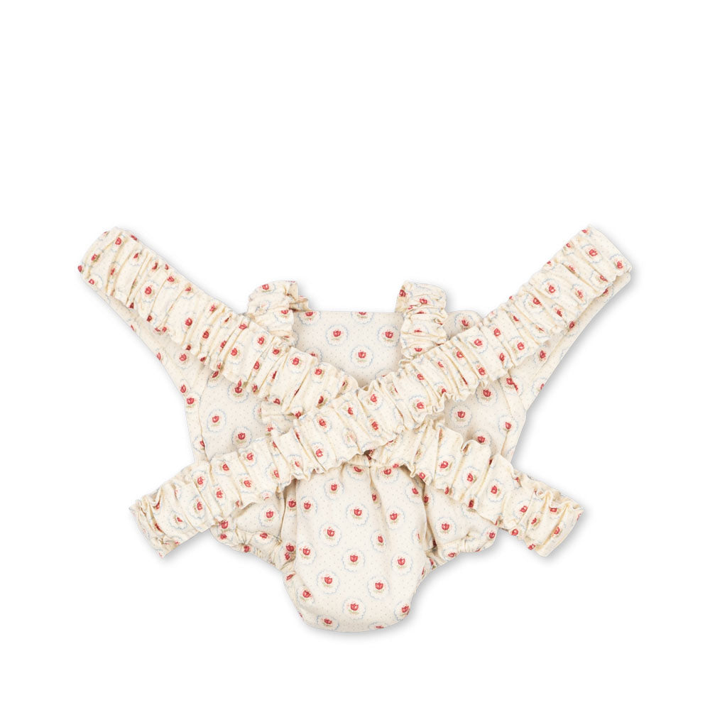An enchantingly beautiful doll carrier from Konges Slojd, which allows your child to have their favorite doll very close to them. And still have your hands free! The doll carrier is made from 100% printed organic cotton. Designed with elastic straps and scalloped cuffs. The carrier is easy to use, comfortable and lightweight.
