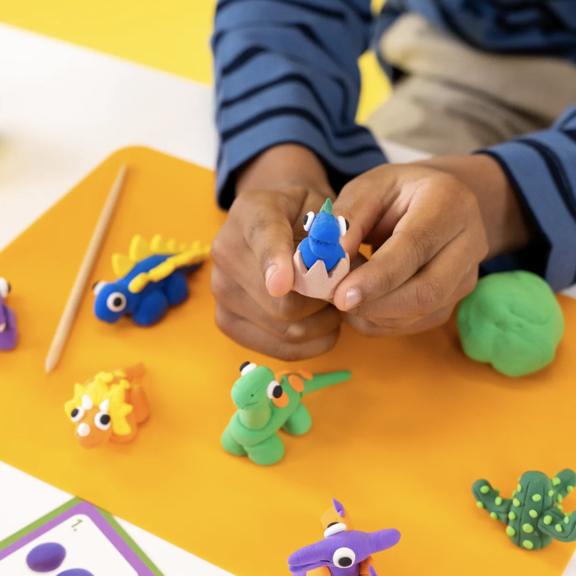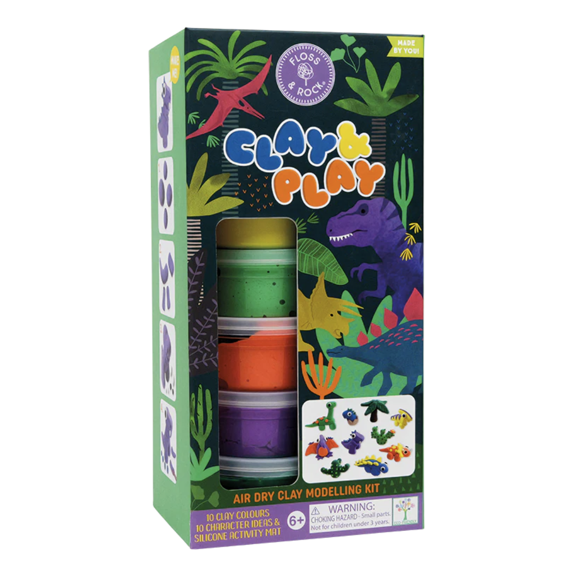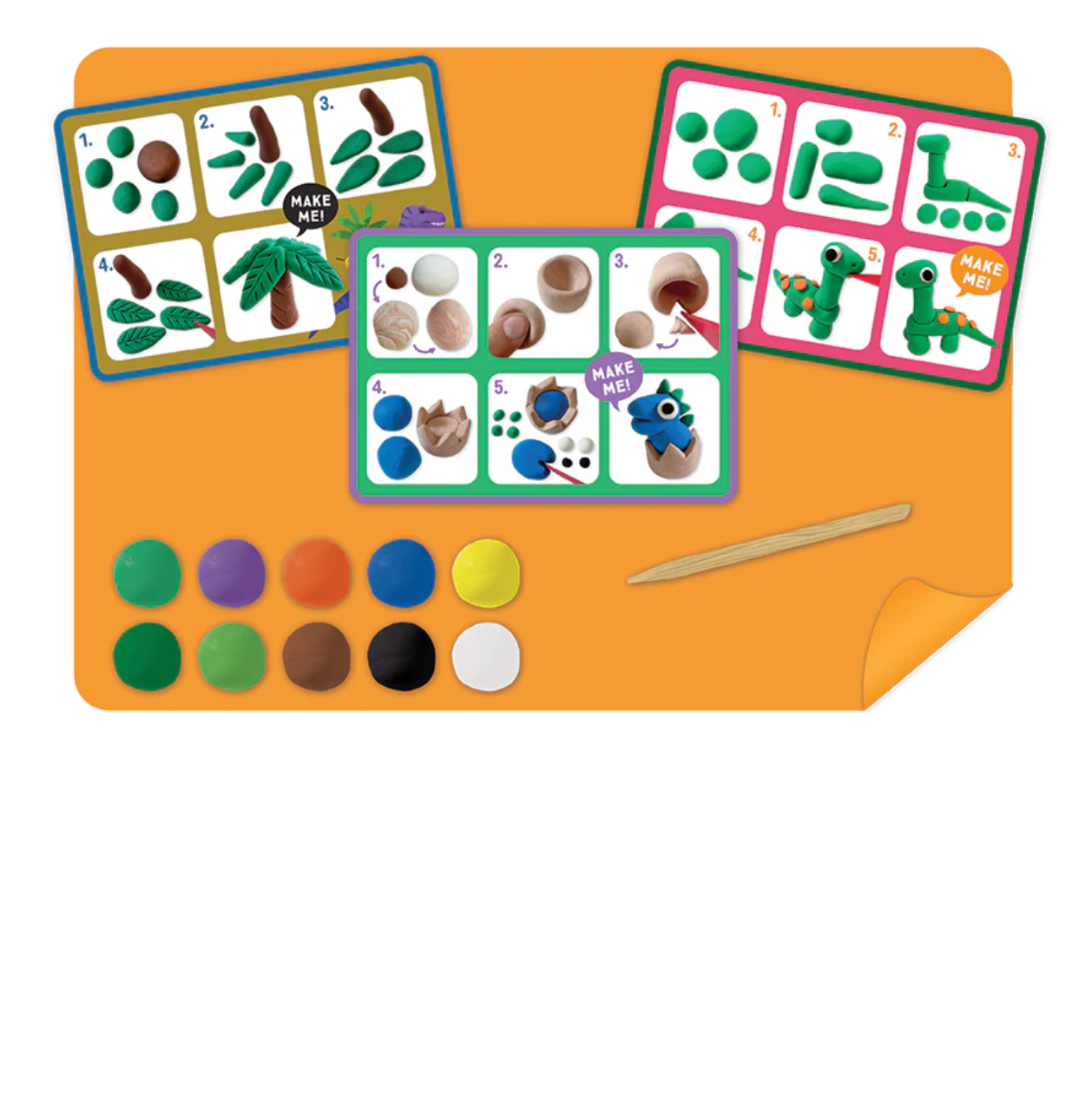 Contents: 6 pots of clay, 5 double-sided instruction cards, silicone mat, wooden tools