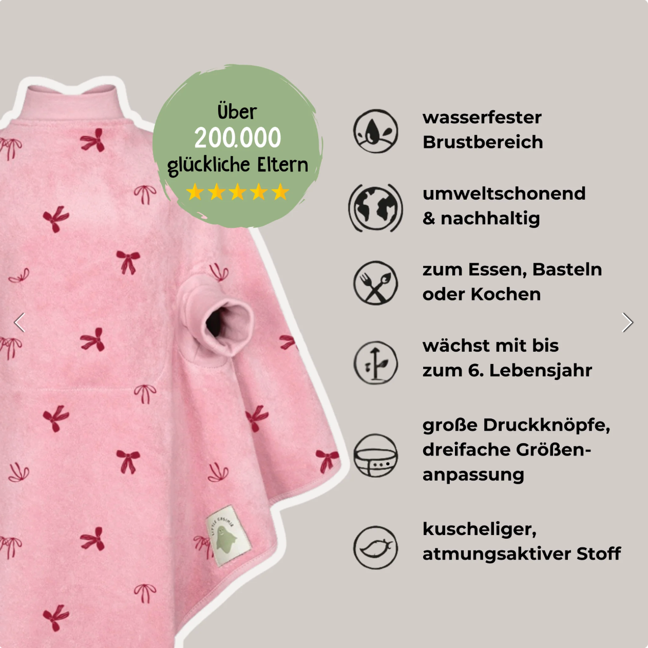 Das Frottee-Lätzchen „Boo“ von little casimir ist ein extra saugstarkes Alltags-Lätzchen mit cleverem Schnitt – gemacht für echte Essensabenteuer vom 6. Monat bis ca. 6 Jahre. Der grosszügige Fit, der flexibel verstellbare Kragen und die krempelbaren Ärmel sorgen für maximalen Komfort und Bewegungsfreiheit. Im Brustbereich schützt eine unsichtbar integrierte, wasserabweisende Innenlage zuverlässig davor, dass Feuchtigkeit bis zur Kleidung durchdringt – ideal für Brei, Snacks und Kindergarten-Mahlzeiten. Für alle, die weiche Textillösungen lieben und bewusst auf starre Plastik- oder Silikonlätzchen verzichten.