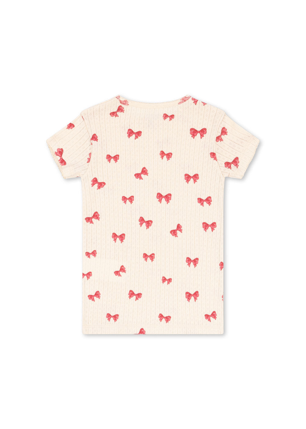 The Minnie T-shirt Rosia Bow by Konges Sløjd is a delicate basic with lovely details. The delicate all-over pointelle pattern gives the shirt a special texture, while the soft, breathable fabric made of 100% organic cotton ensures maximum comfort. A versatile essential that's perfect for layering – whether worn solo or under a dress.