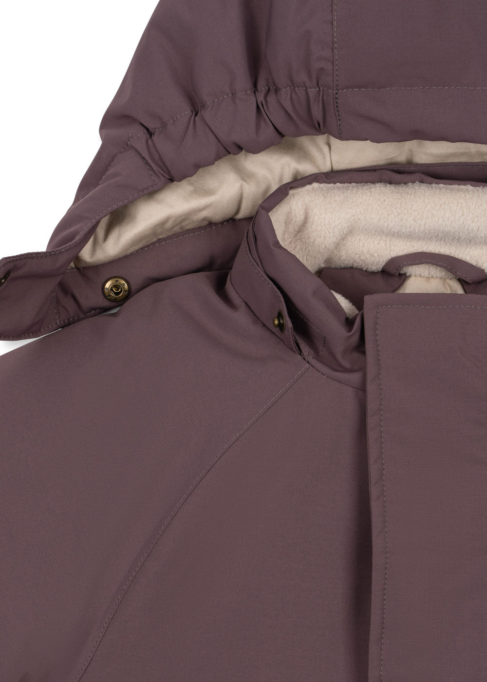 A highly breathable, waterproof and windproof snowsuit made from 100 percent polyester. The hood is removable and can be fastened with buttons. Elastic cuffs and rubber foot loops ensure that the snowsuit stays firmly in place on the hands and feet. There are suspenders on the inside that make it easier for the child to take off the upper part of the snowsuit if they get too warm or go inside