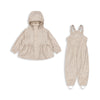 Wind- and waterproof PU rain set with fluffy fleece lining and removable hood that is attached with buttons. Elastic cuffs on hands and feet ensure the set stays in place. The jacket closes with a zipper and buttons and has practical inner loops and side pockets. Sizes 9 months-4Y have suspenders & those 5-6 & larger have an adjustable waistband.