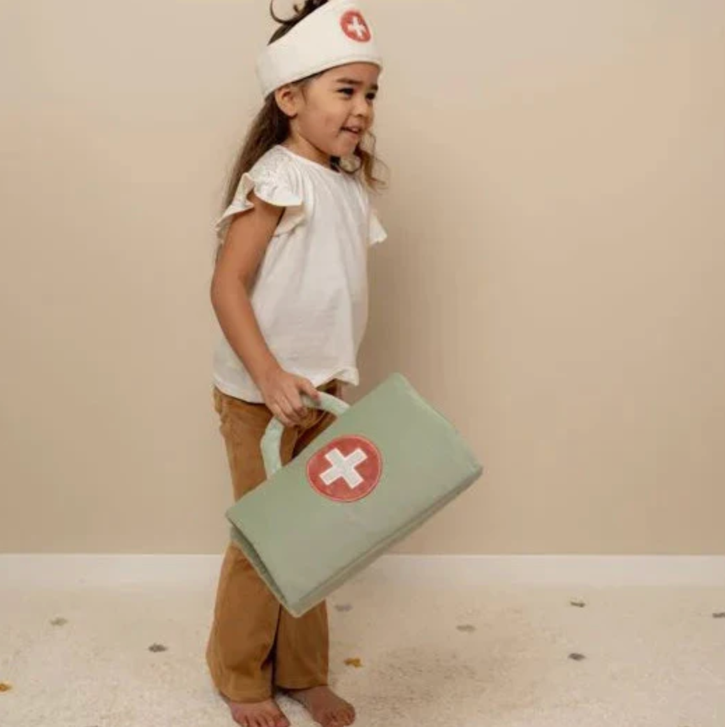 Aider et soigner de manière ludique : grâce au coffret docteur et poupée Little Dutch, conçu avec amour, les jeunes médecins et infirmières peuvent s'immerger dans des jeux de rôle imaginatifs. Équipé de tout le nécessaire pour soigner poupées, peluches ou amis, du stéthoscope aux pansements, ce coffret favorise l'empathie, la créativité et la motricité fine.