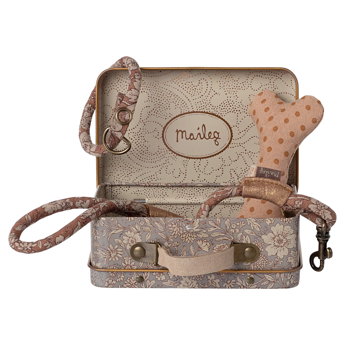 Cet ensemble contient tout ce dont vous avez besoin pour votre chien en peluche douce. L'ensemble comprend un os, un collier et une laisse, joliment emballés dans un étui en métal avec un bel imprimé Maileg.