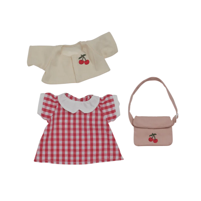 Une journée remplie de magie de pique-nique, de couronnes de marguerites volantes et de doigts de confiture collants : l'ensemble « Cherry Gingham » est fait pour les plus doux souvenirs d'enfance. Il comprend une robe à carreaux confectionnée avec amour, un cardigan brodé et un petit sac bandoulière – parfait pour accompagner les poupées Dinkum dans leurs aventures au jardin.
