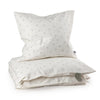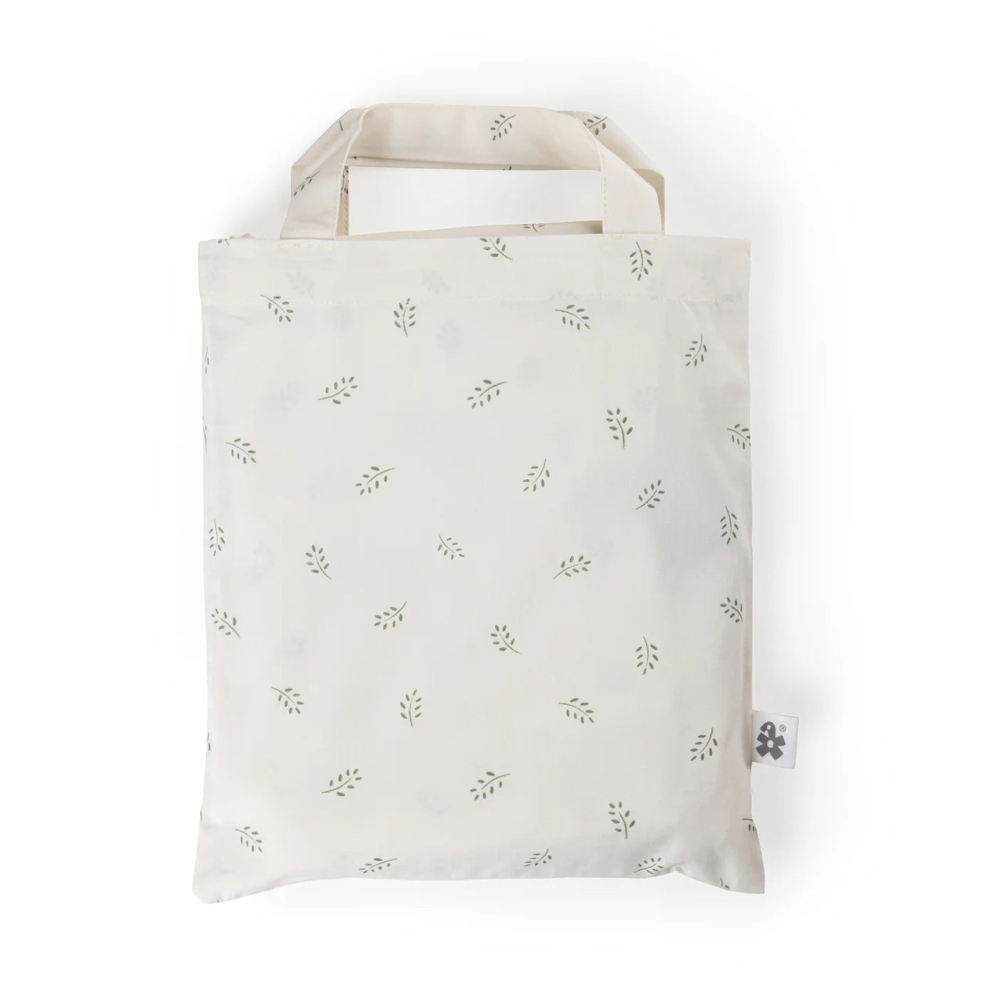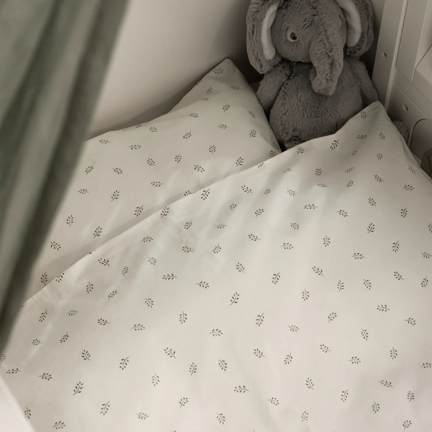 Ce linge de lit haut de gamme en percale de coton biologique raffinée séduit par son tissage dense, sa surface mate et douce et le motif « Feuilles de Sophora » de Sebra, soigneusement conçu. Une petite étiquette en forme de feuille cousue sur la housse de couette fait office de mini-doudou à saisir et à apaiser : une attention particulière pour les petites mains fatiguées de bébé.