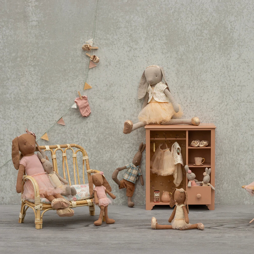 Ce banc en rotin convient aux lapins de taille 3 et à leurs autres petits compagnons. Il est fourni avec un coussin moelleux. Fabriqué en rotin non blanchi, de légères variations peuvent apparaître.