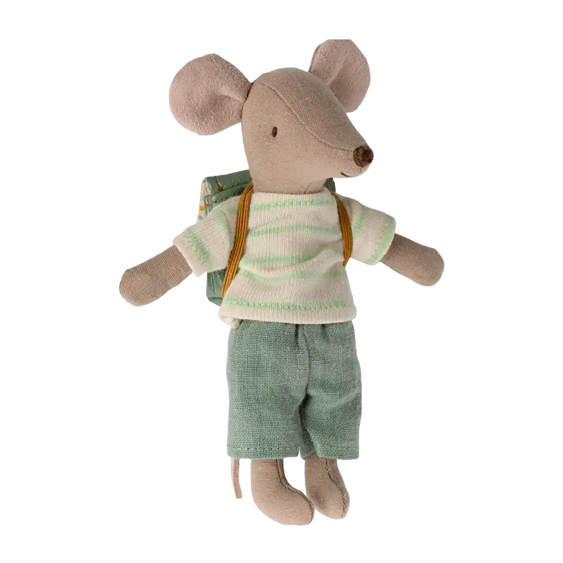 Die große Schwester Maus ist bereit für einen Schultag und trägt ihren Rucksack auf dem Rücken. Sie hat Magnete in ihren Händen, damit sie die Griffe des Dreirads für eine schnelle Fahrt halten kann.