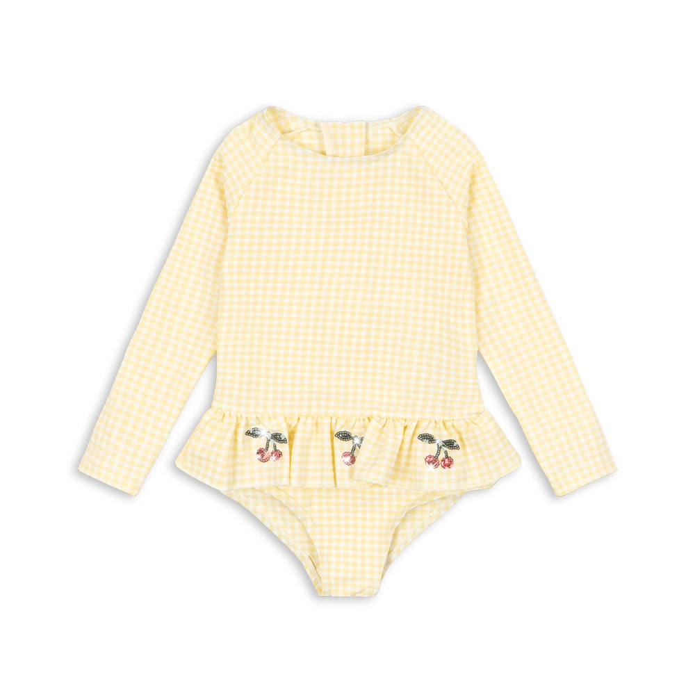 Der Etta Bikini ist ein liebevoll gestalteter Bikini aus strukturiertem Seersucker-Stoff – verspielt, bequem und ideal für sonnige Tage am Strand oder Pool. Zarte Rüschen und funkelnde Kirschen aus Pailletten machen ihn zu einem echten Hingucker, während das schnelltrocknende, flexible Material für hohen Tragekomfort sorgt. Für die kleineren Grössen erleichtern praktische Druckknöpfe an den Beinöffnungen das An- und Ausziehen.