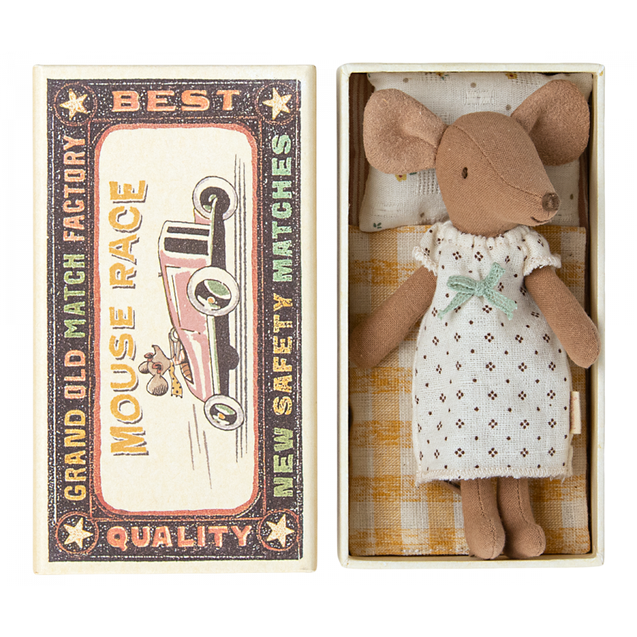 Ein klassischer Maileg-Artikel. Diese Maus ist bereit für stundenlanges Spielen und schläft fest in der Streichholzschachtel. Die Kleidung und Bettwäsche kommt mit einzigartigen Maileg-Drucken und schönen Farben.