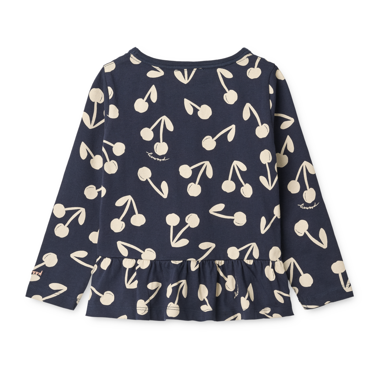 Das Margit Langarmshirt verleiht dem Alltag einen verspielten Touch. Mit seinem charmanten Kirsch-Print und dem ausgestellten Peplum-Saum bringt es frische Leichtigkeit in jedes Outfit. Aus weichem, glattem Bio-Baumwolljersey gefertigt, ist es besonders angenehm zu tragen und vielseitig kombinierbar.